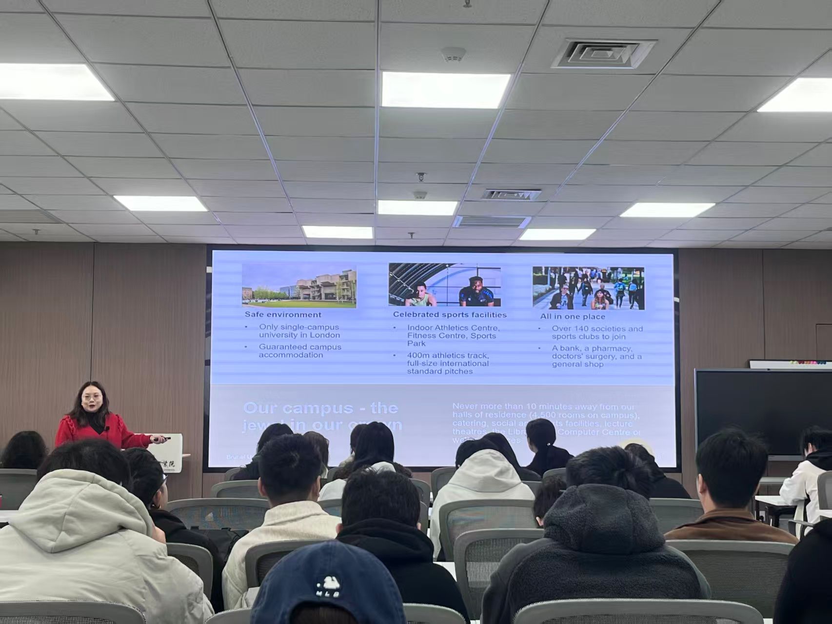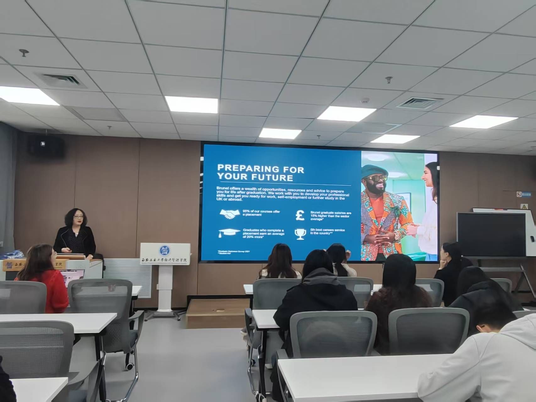 Monica Yang详细介绍了英国布鲁内尔大学的地理位置、校园设施和学术实力。她特别强调,作为伦敦唯一拥有完整一体化校园的大学,布鲁内尔为学生提供了既安全又充满活力的学习环境。江南聚焦于商科专业方向,详细向同学们解读了课程结构、教学资源及毕业生去向,用生动的案例和详实的数据,让在场学生对商学院专业有了更加立体的认识。